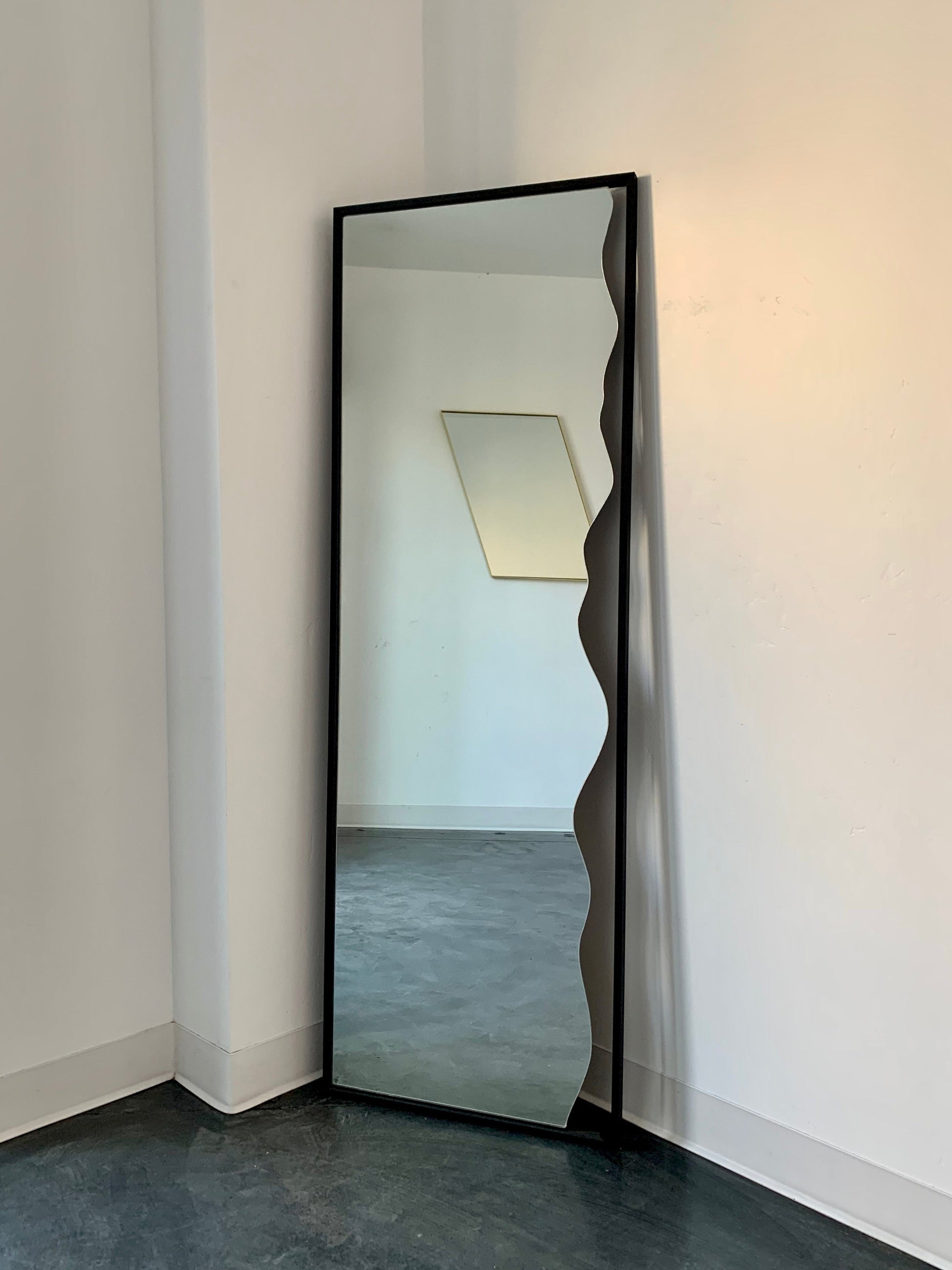 Our Organic Edge Full-Length Mirror exudes luxury. Expertly crafted, this mirror features a striking amoeba-shaped edge, blending organic design with modern aesthetics. The sleek, black metal frame enhances its contemporary look, making it a standout piece for any room. Measuring 20 inches by 60 inches, this mirror not only adds visual depth but also serves as a functional piece of art. Ideal for bedrooms, living areas, or any space that requires a touch of unique style.