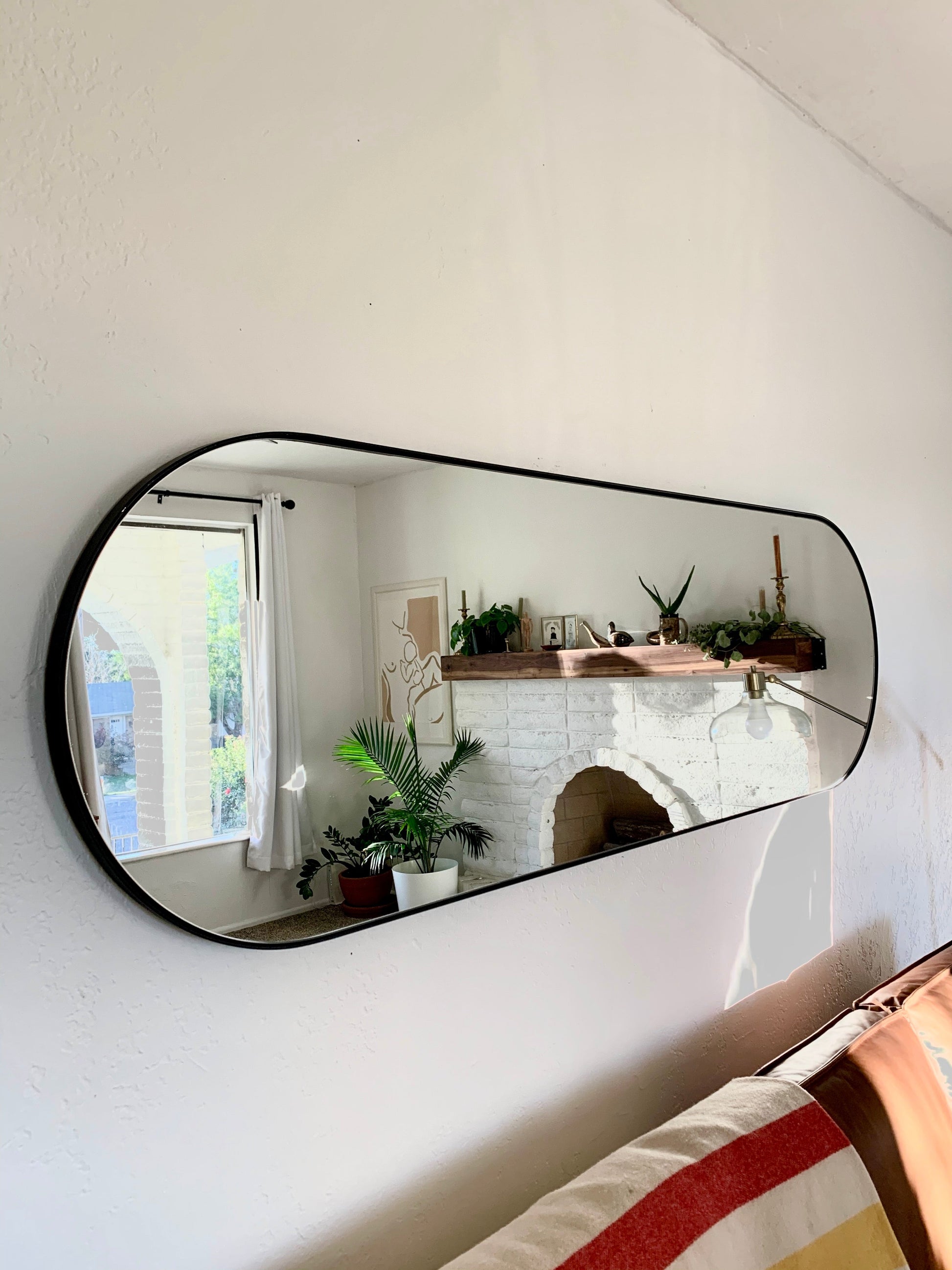 Add timeless style to your space with our handcrafted custom capsule mirror, designed and built with care in our small husband-and-wife workshop in Utah. This modern oval, pill shaped mirror features a sleek, hand-welded metal frame, blending industrial durability with an airy, contemporary feel that works beautifully in bathrooms, entryways, bedrooms, or living spaces.